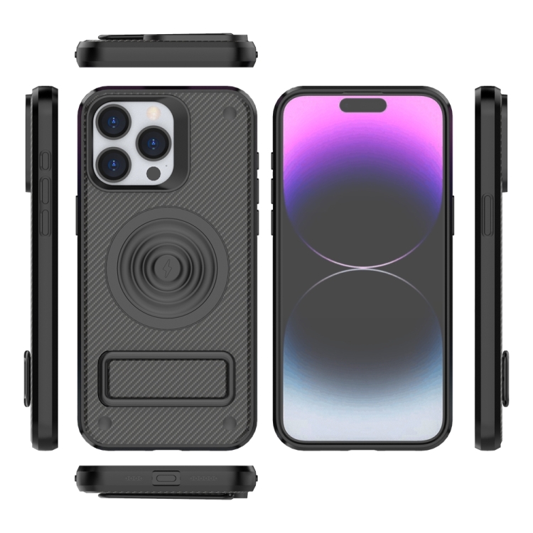 Funda para Teléfono iPhone 15 Pro Max PC + TPU Textura Fibra de Carbono con Soporte de Metal (Negro)