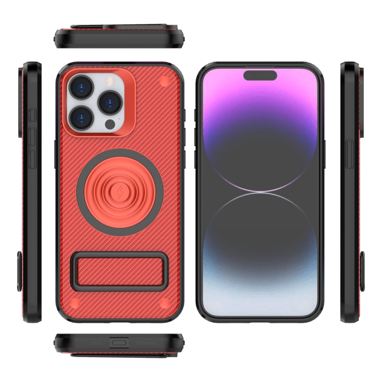 Funda para Teléfono iPhone 15 Pro Max PC + TPU Textura Fibra de Carbono con Soporte de Metal (Rojo)