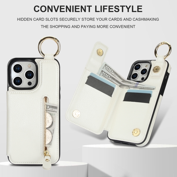 Funda para teléfono iPhone 15 Pro Max Litchi Texture Cremallera Doble Hebilla con Bolsa para Tarjetas (Blanco)