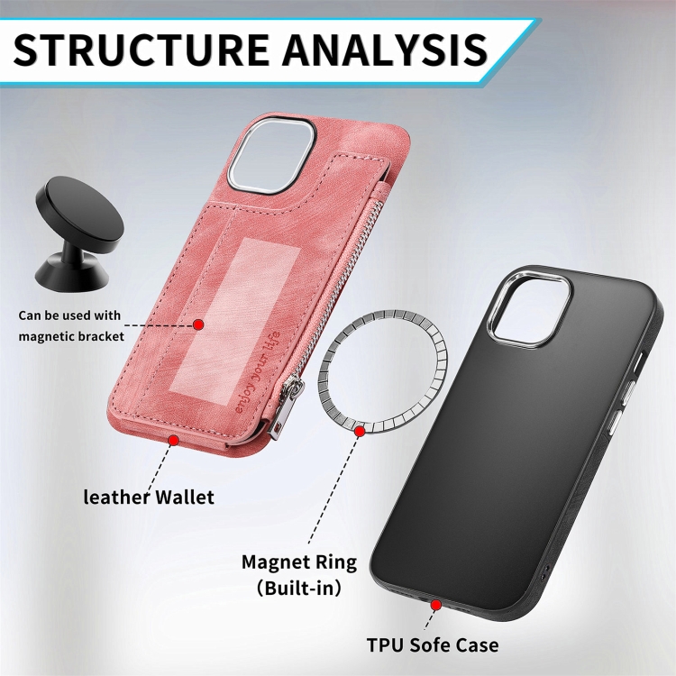 Funda para Teléfono iPhone 15 Pro Max Magsafe Zipper Rfid Wallet Todo Incluido a Prueba de Golpes (Rosa)