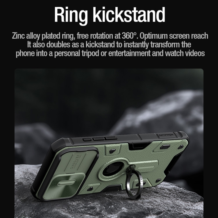 Funda Protectora Nillkin Camshield Armor para iPhone 15 Pro Max a Prueba de Golpes con Soporte de Anillo Invisible (Verde)