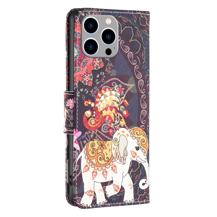 Funda de Cuero Flip para iPhone 15 Pro Max Patrón Dibujo Coloreado Elefante de Flores