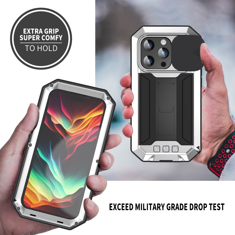 Funda para iPhone 15 Pro Max R-Just Sliding Camera Life Impermeable con Soporte (Plateado)