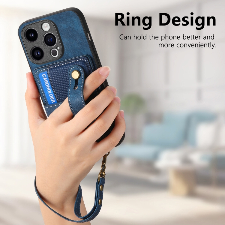 Funda Trasera para iPhone 15 Pro Max Retro Cross Muñequera Monedero de Cuero (Azul)