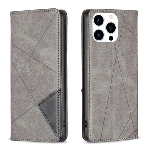 Funda para iPhone 15 Pro Max Rhombus Texture Caja de Teléfono de Cuero Magnético (Gris)