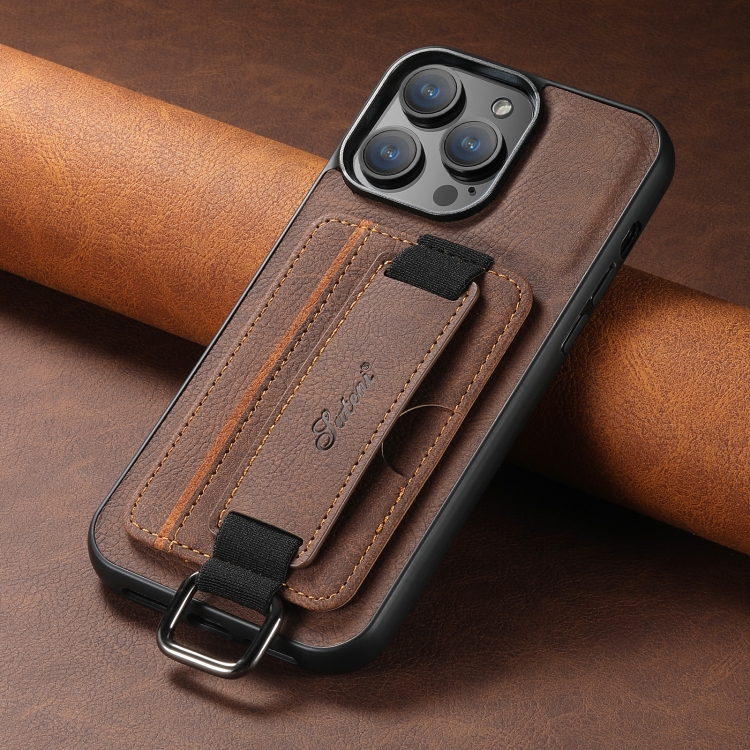 Funda para Teléfono Suteni H13 para iPhone 15 Pro Max con Correa para Muñeca de Cuero Litchi (Marrón)