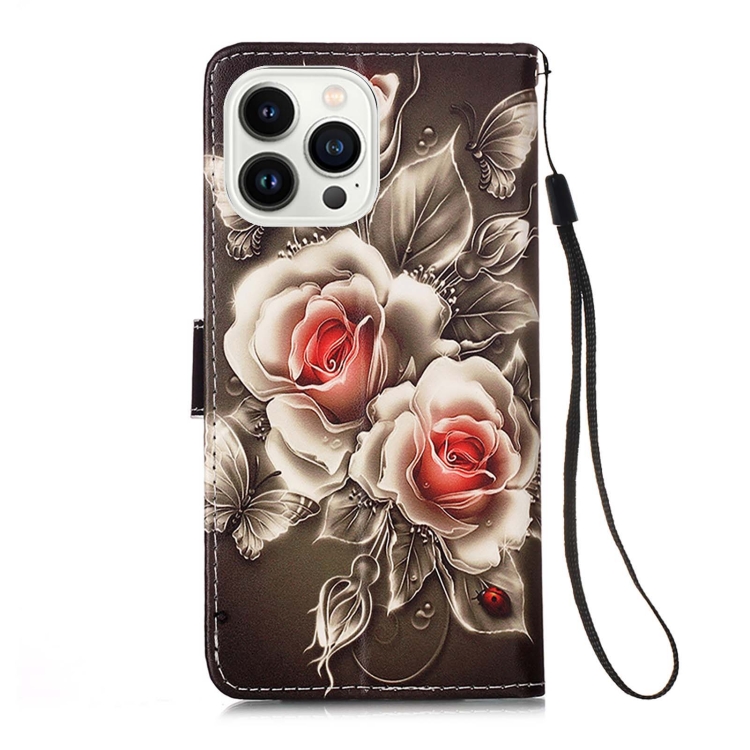 Funda para iPhone 15 Pro Cuero Tejido Liso Patrón Dibujo Coloreado (Rosas en Negro)