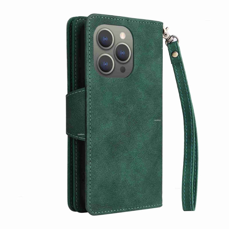 Funda para iPhone 15 Pro de Cuero con Remache Hebilla y 9 Tarjetas con Tres Pliegues (Verde)
