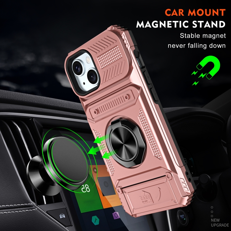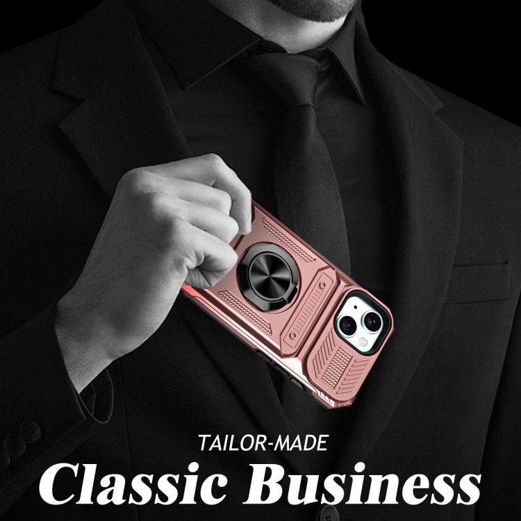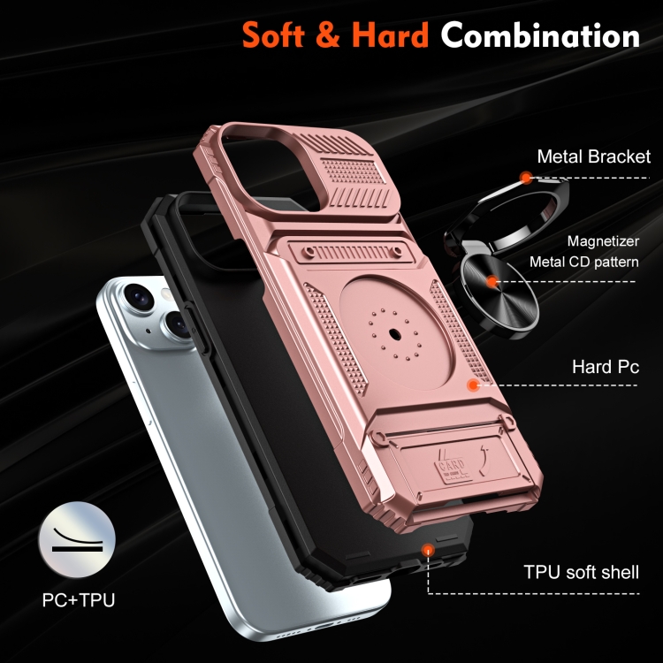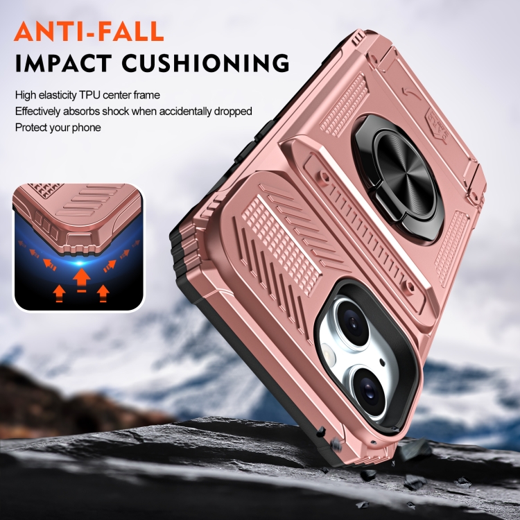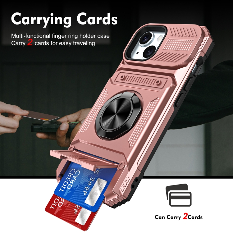 Funda para Teléfono iPhone 15 TPU + PC con Tarjeta y Soporte para Anillo de Metal (Oro Rosa)