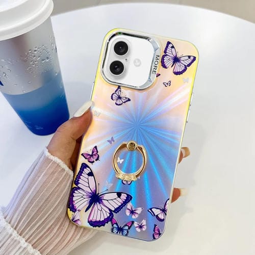 Estuche para teléfono iPhone 16 con soporte para anillo mariposa láser galvanoplastia (Morado)