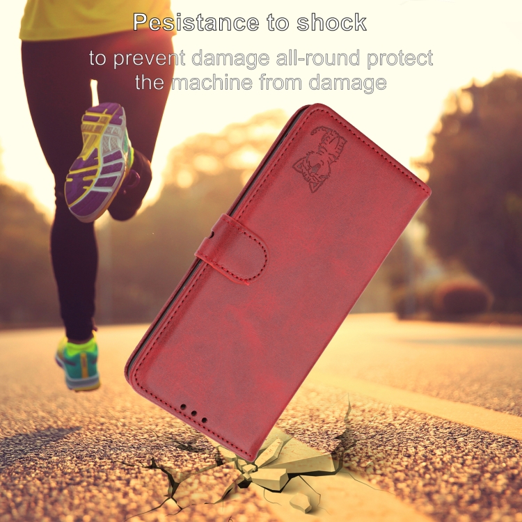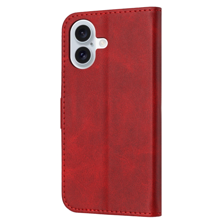 Funda de Teléfono iPhone 16 Cuero con Tapa Patrón Gato Feliz en Relieve (Rojo)