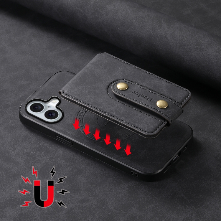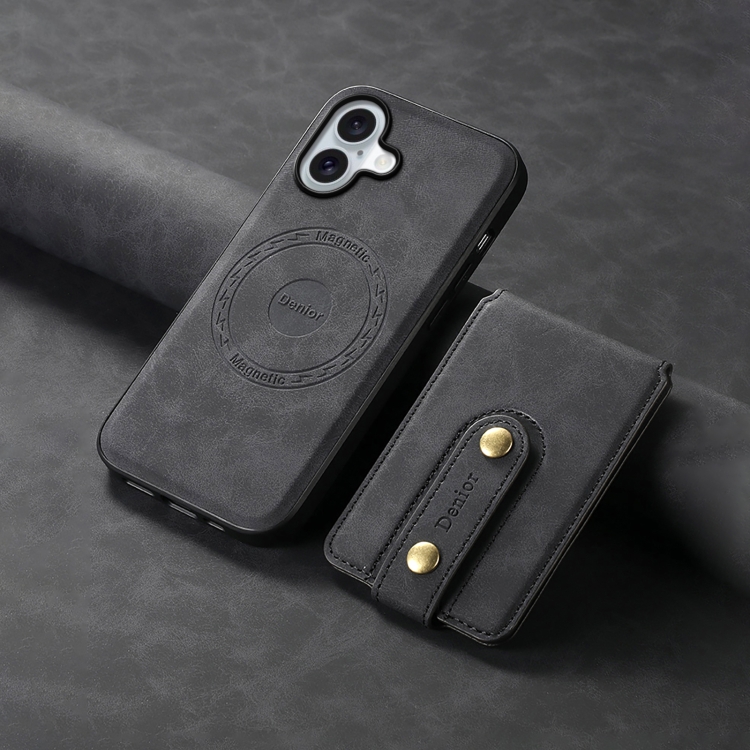 Estuche de Cuero Denior D14 Nk para iPhone 16 Plus con Tarjetero Magnético Magsafe y Patrón Retro (Negro)