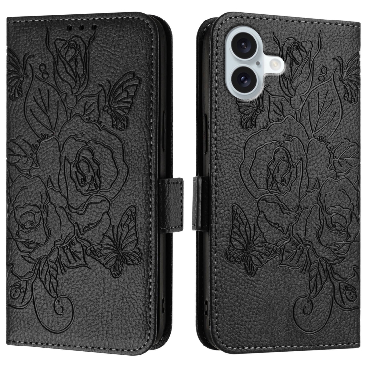 Estuche para Teléfono iPhone 16 Plus Cuero Antirrobo Rfid con Rosa En Relieve (Negro)