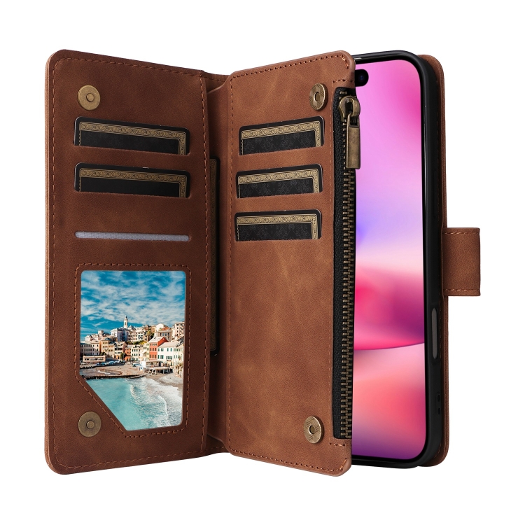 Funda Cruzada de Cuero para iPhone 16 Plus con Cremallera y Ranura para Tarjetas (Marrón)