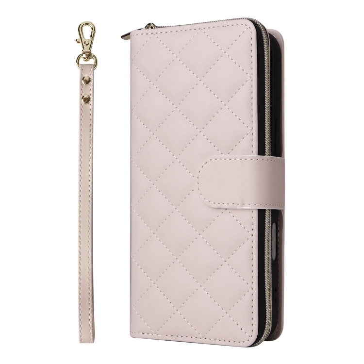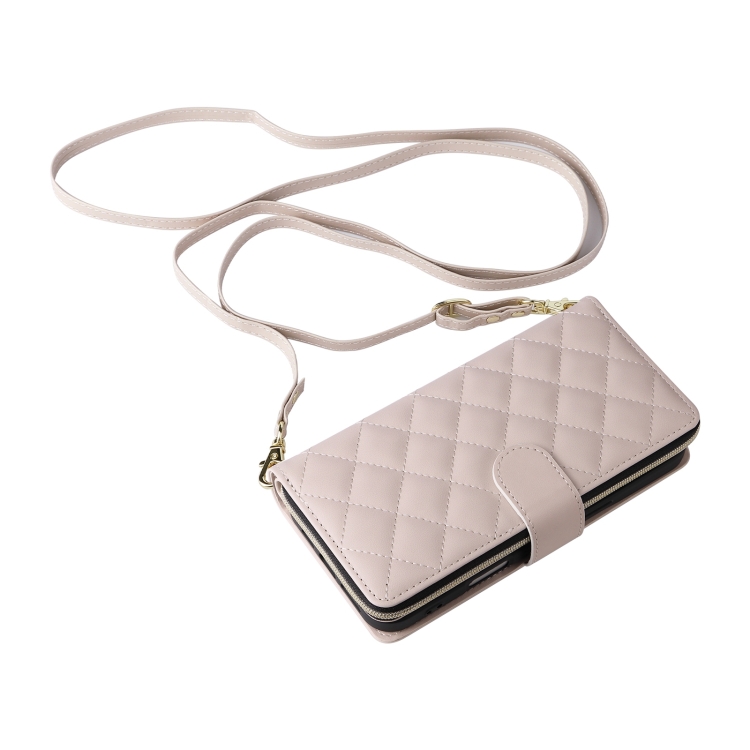 Funda Cruzada de Cuero para iPhone 16 Plus con Hebilla Torre y Cremallera Rombal con Cordón (Beige)
