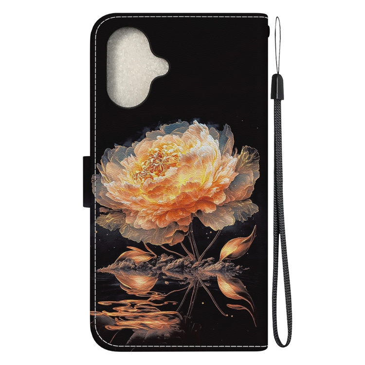 Funda de Cuero para iPhone 16 Plus con Dibujo Coloreado y Textura de Cristal (Peonía Dorada)
