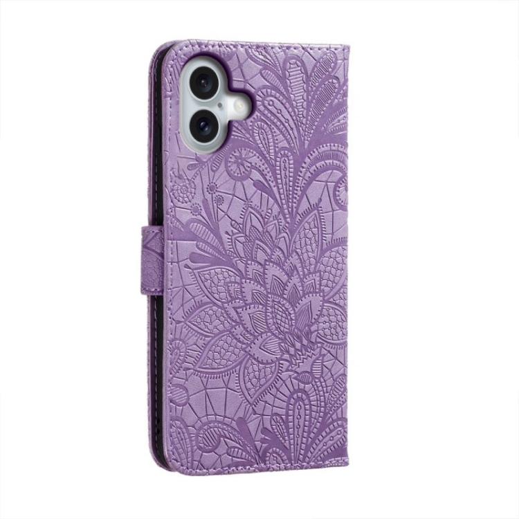 Funda de Cuero para iPhone 16 Plus con Tapa y Estampado de Flores de Encaje (Púrpura)