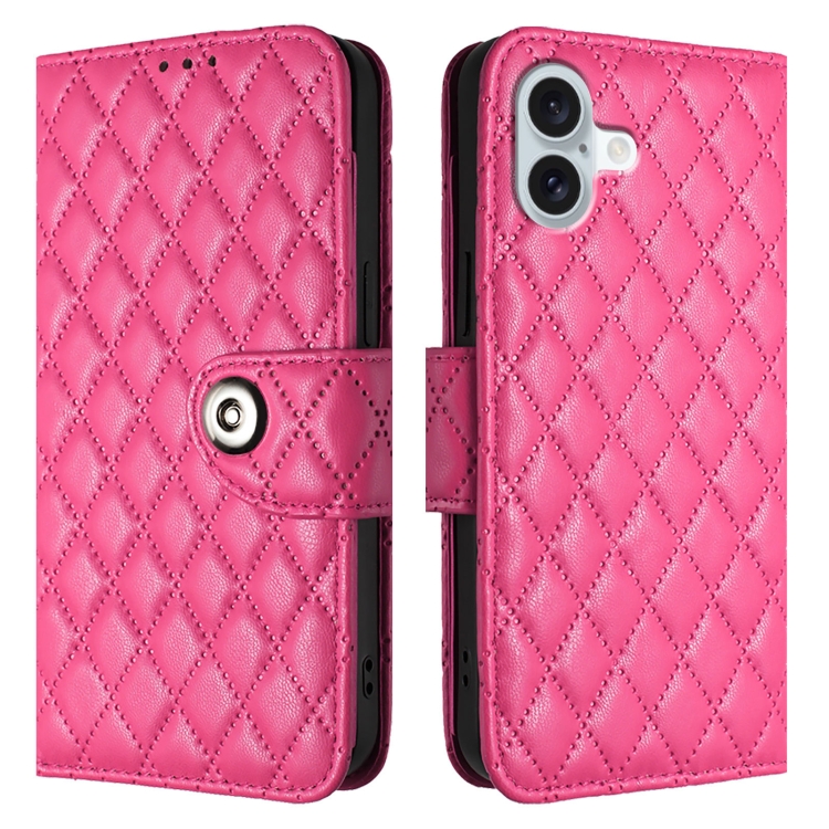 Funda de Cuero para iPhone 16 Plus con Tapa y Textura Rómbica con Cordón (Rojo Rosa)