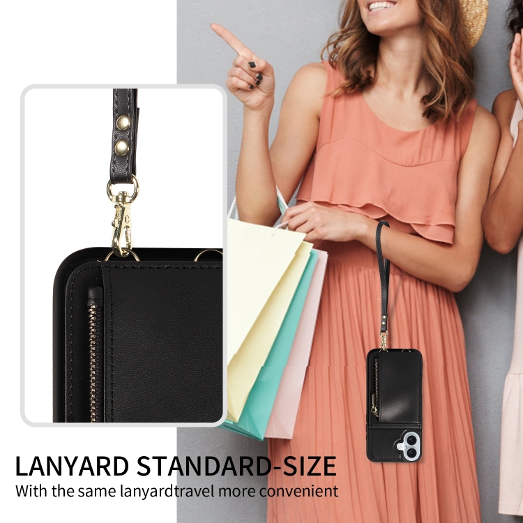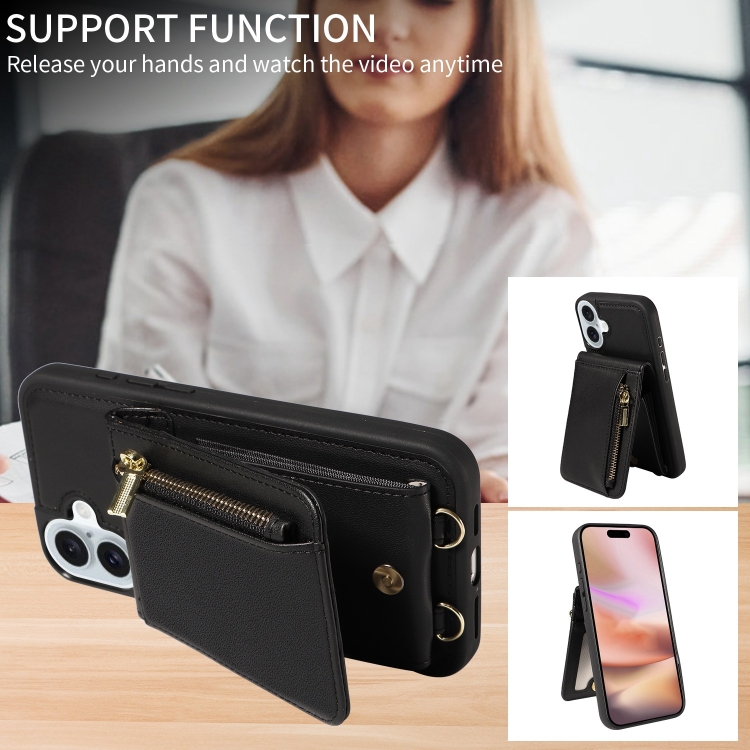 Funda para Teléfono iPhone 16 Plus Cuero con Billetera Cremallera y Cordón Cruzado (Negro)