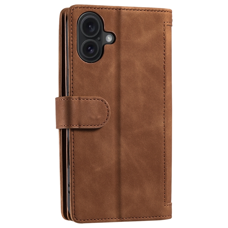 Funda de Cuero para iPhone 16 Plus con Bolsa con Cremallera y Nueve Tarjetas con Cordón (Marrón)