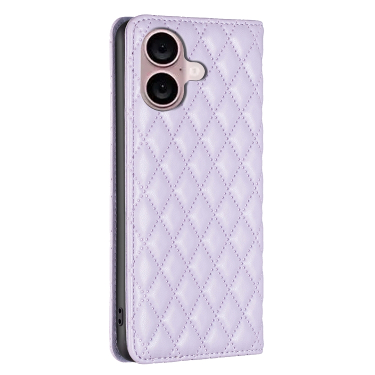 Funda para teléfono iPhone 16 Plus con tapa de cuero magnético Diamond Lattice (Púrpura)