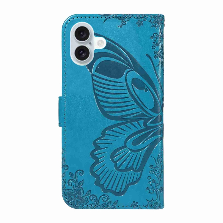 Funda para Teléfono iPhone 16 Plus Cuero Relieve Mariposa Cola de Golondrina (Azul)
