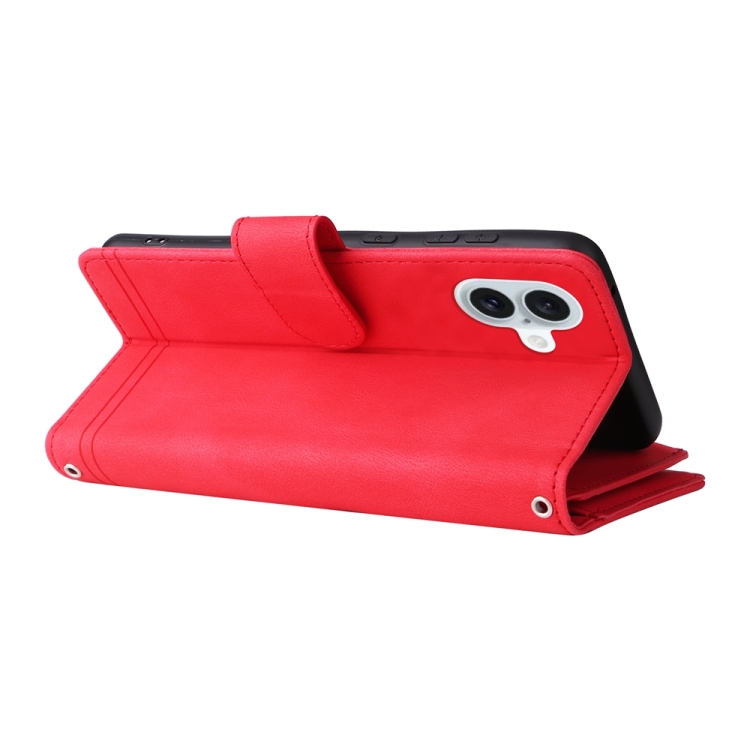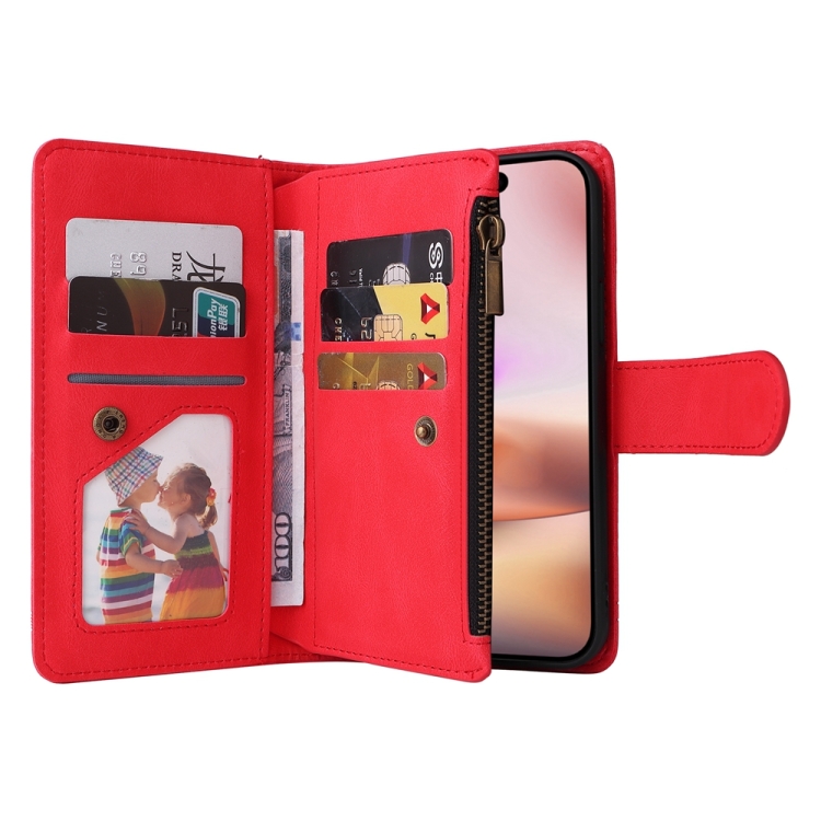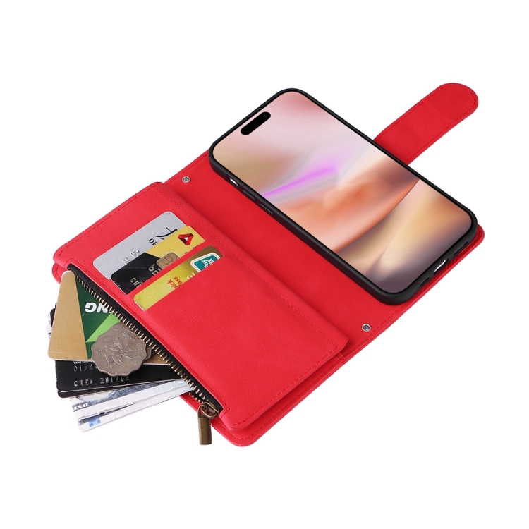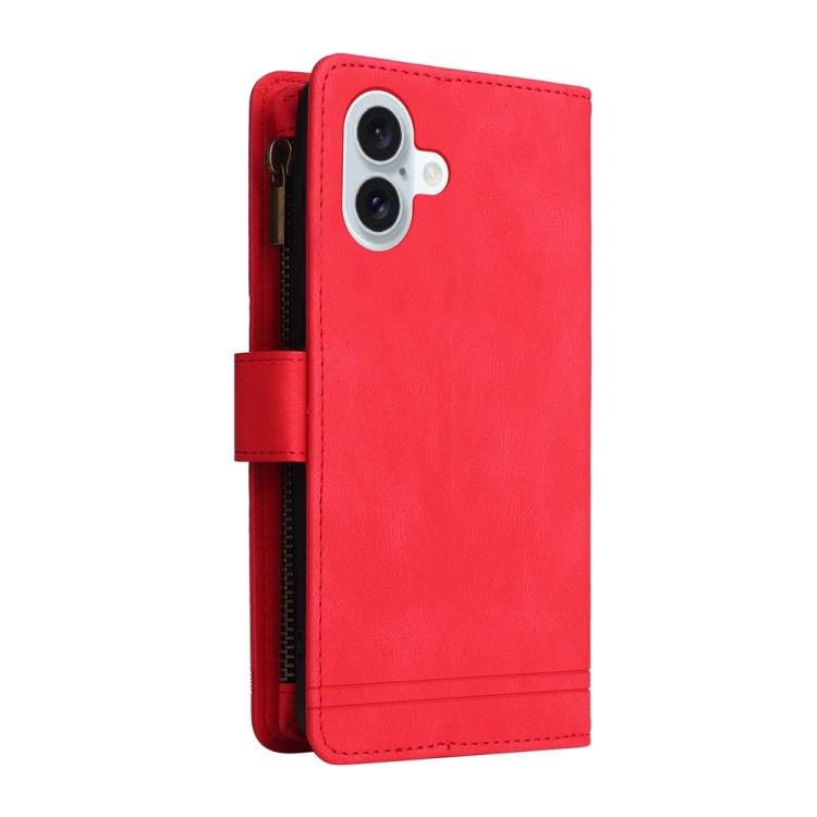 Funda para teléfono iPhone 16 Plus Skin Feel de cuero con cremallera y billetera con múltiples tarjetas (Rojo)