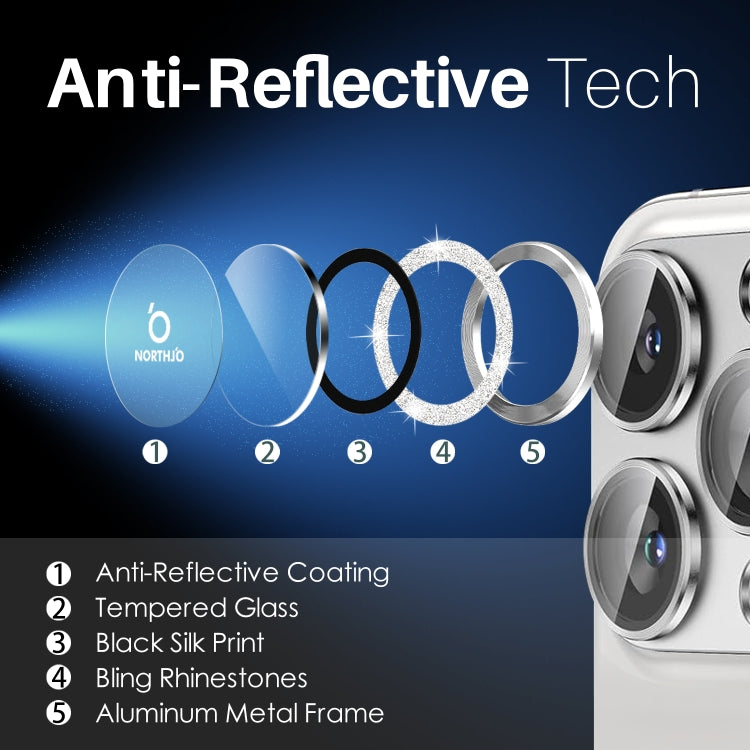 Protector de Lente de Cámara Northjo para iPhone 16 Pro y 16 Pro Max con Película de Anillo de Metal y Purpurina (Plata)