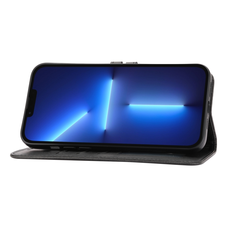 Funda de Teléfono iPhone 16 Pro Cuero con Tapa y Patrón de Gato Feliz en Relieve (Azul)