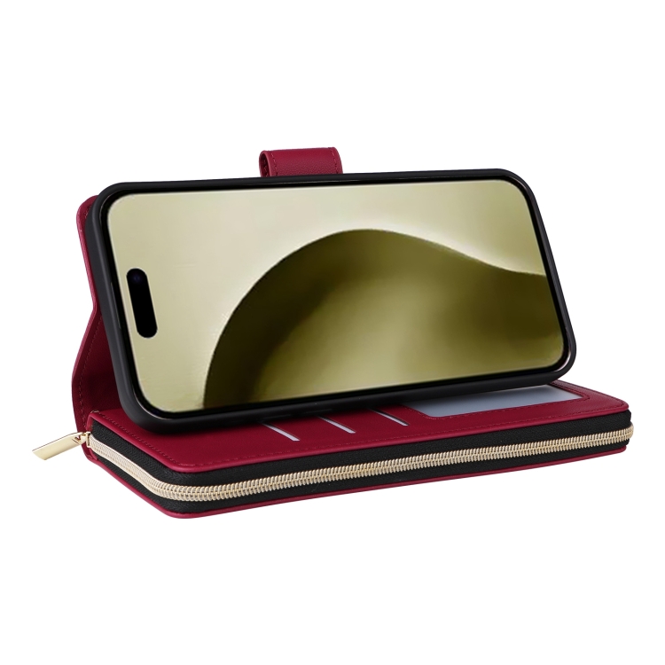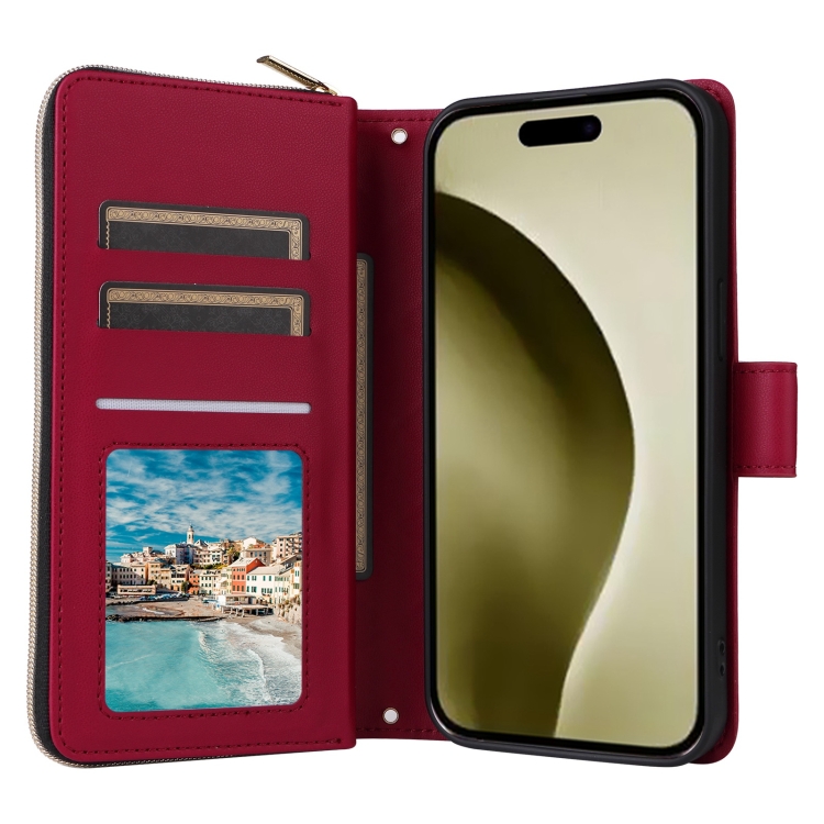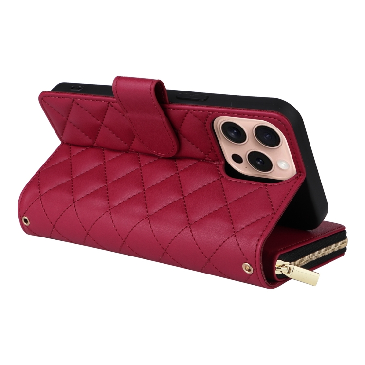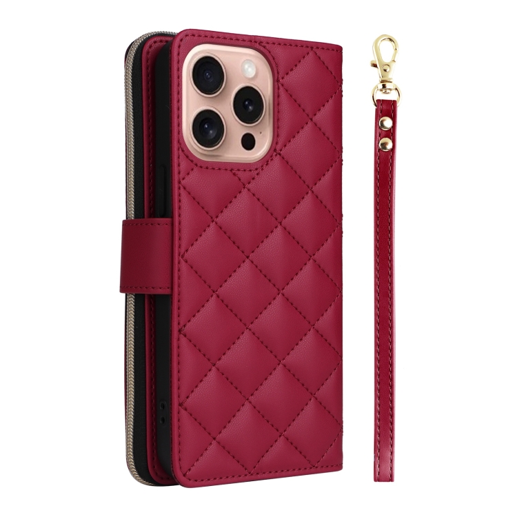Funda para Teléfono iPhone 16 Pro Cuero Hebilla Torre Cremallera Rombal Cruzada Cordón (Rojo Vino)