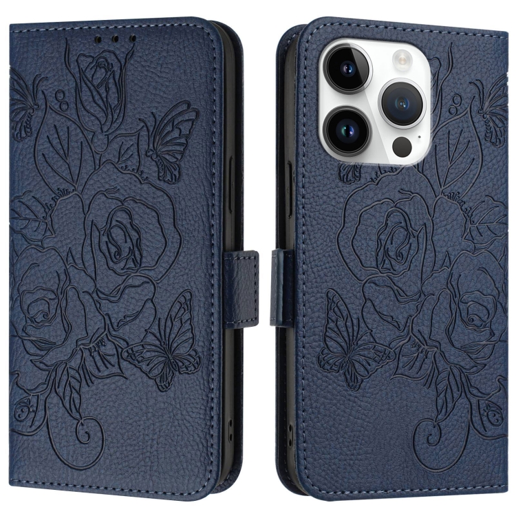 Estuche para teléfono iPhone 16 Pro Max cuero antirrobo RFID con rosa en relieve (Azul Oscuro)