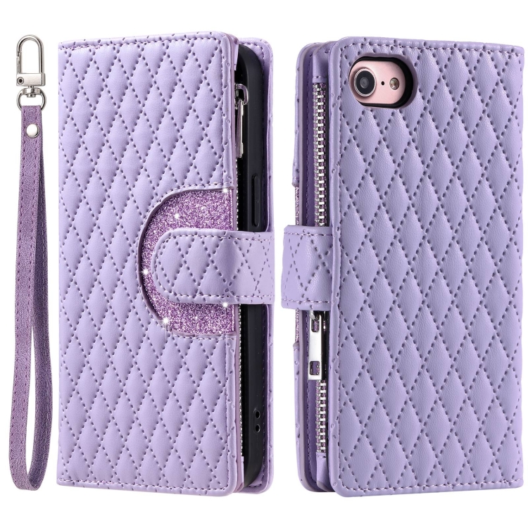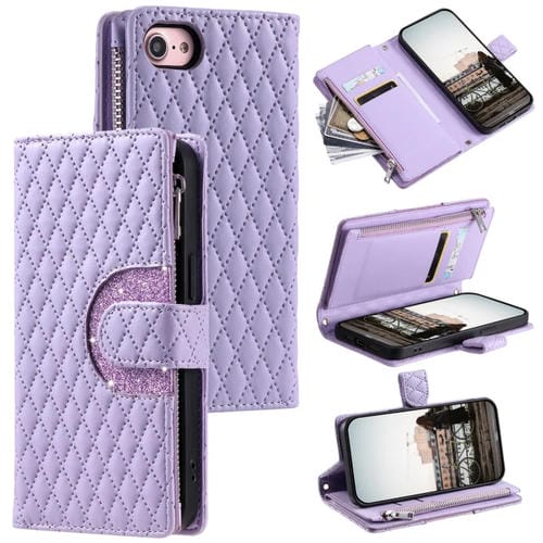 Estuche para Teléfono iPhone 7/8/Se 2022 Cuero con Billetera Cremallera Celosía Purpurina (Púrpura)
