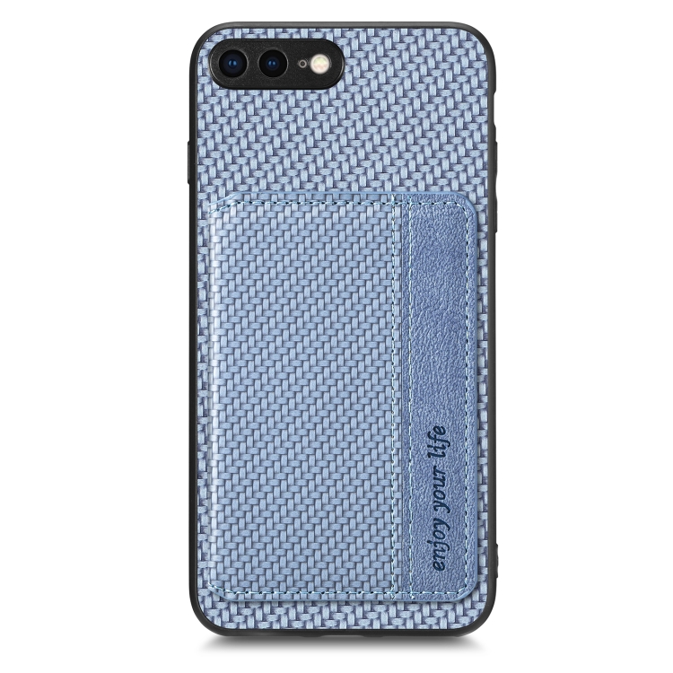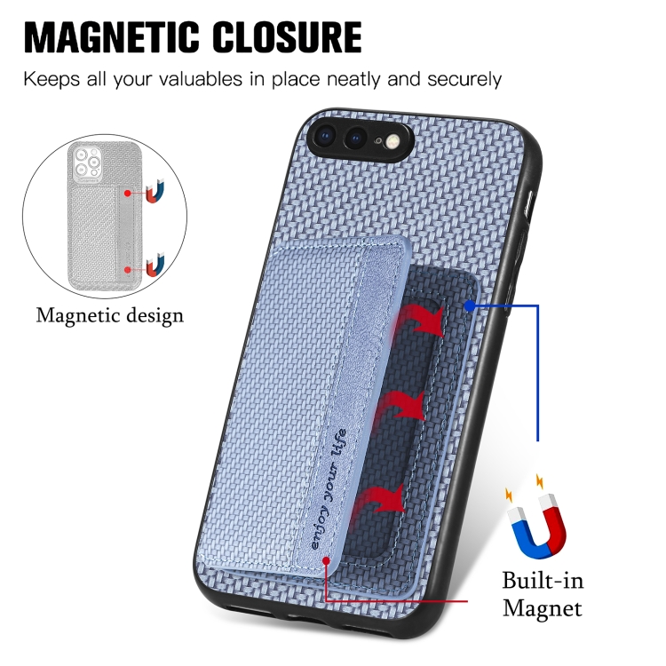 Caja de teléfono para iPhone 7 Plus y 8 Plus con bolsa de tarjeta magnética de fibra de carbono (Azul)