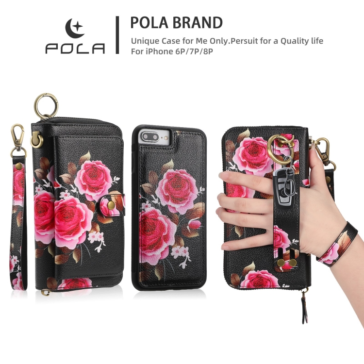 Funda de Cuero para Teléfono iPhone 7 Plus/8 Plus con Billetera y Cremallera Multifuncional Pola Flower (Negro)