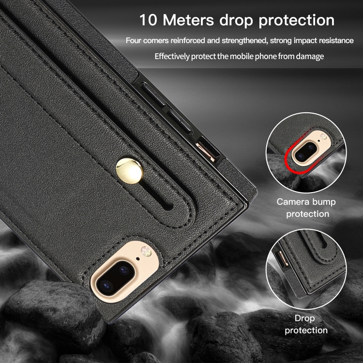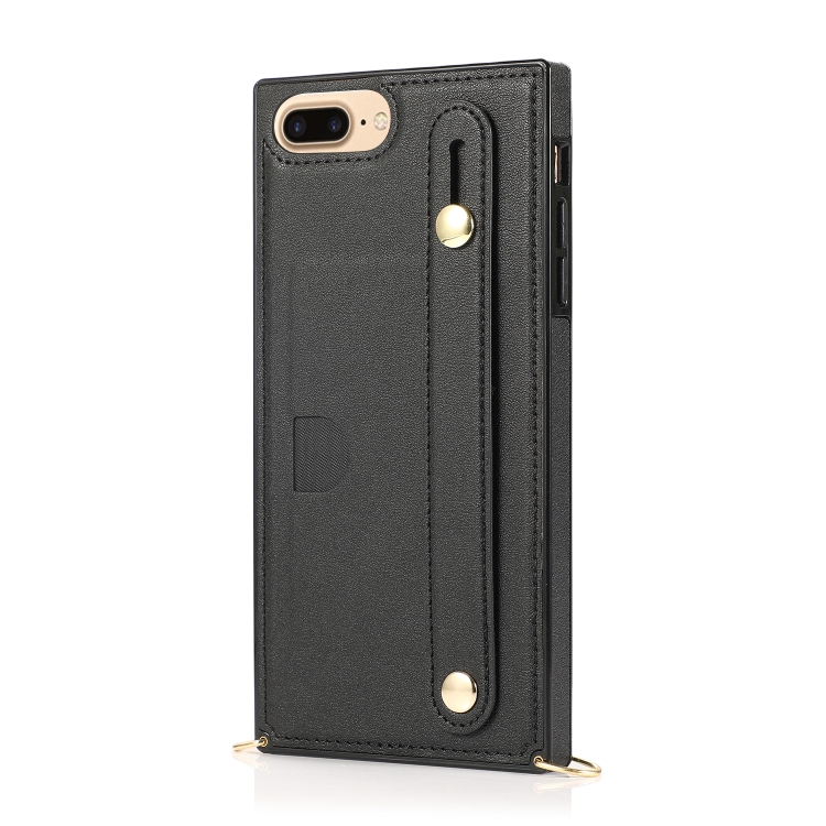 Funda para iPhone 8 Plus y 7 Plus PU + TPU con Correa de Muñeca, Soporte y Ranura para Tarjeta (Negro)