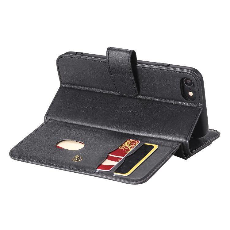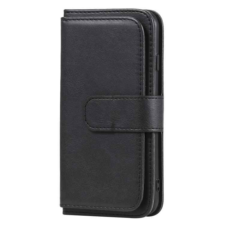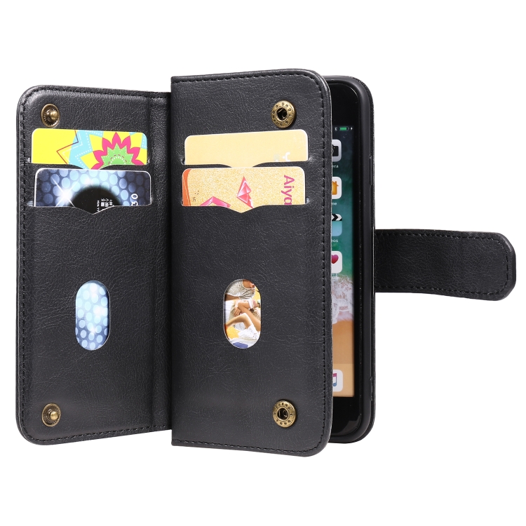 Funda de Cuero Multifuncional para iPhone 8 y 7 con Hebilla de Cobre, Tapa Horizontal, 10 Ranuras para Tarjetas, Billetera, Soporte y Marco de Fotos (Negro)
