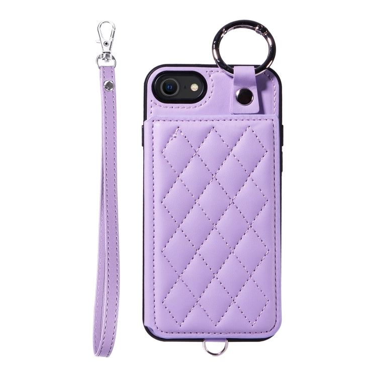 Funda para Teléfono iPhone SE 2022/2020/8/7 con Bolsa para Tarjetas Textura Rómbica y Cordón Corto (Púrpura)