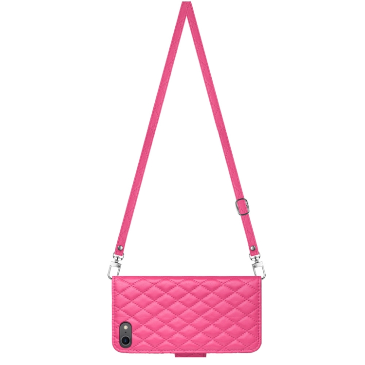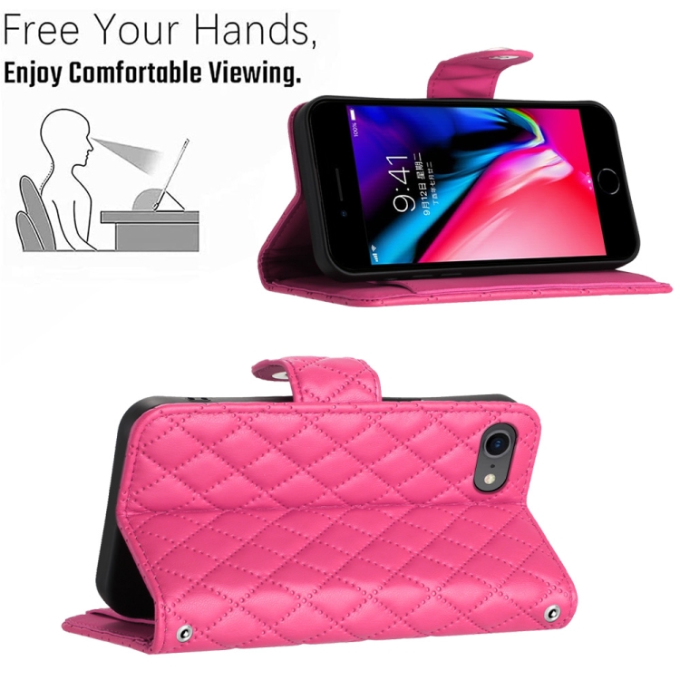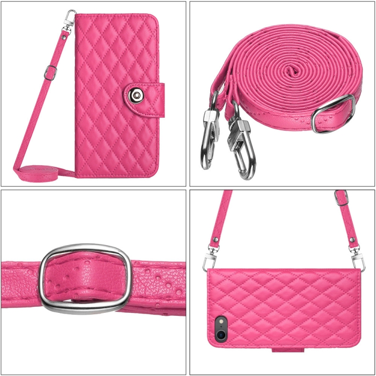 Funda para Teléfono iPhone SE 2022/2020/8/7 con Tapa de Cuero Textura Rómbica y Cordón Largo (Rojo Rosa)