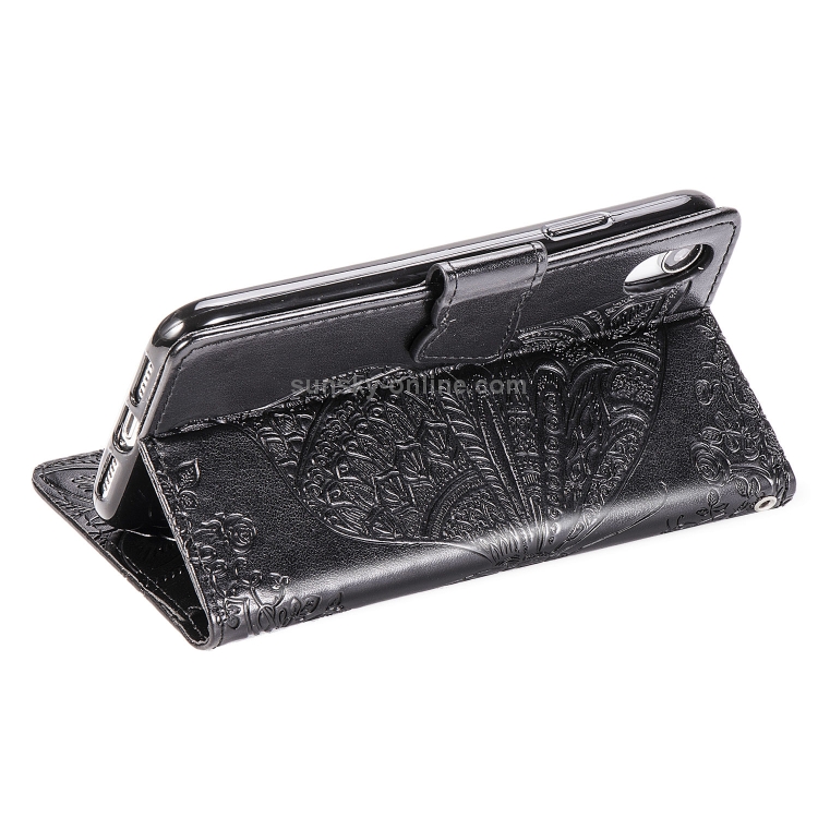 Estuche de Cuero para iPhone X Butterfly Love Flowers con Tapa Horizontal En Relieve Soporte Ranuras y Billetera (Negro)