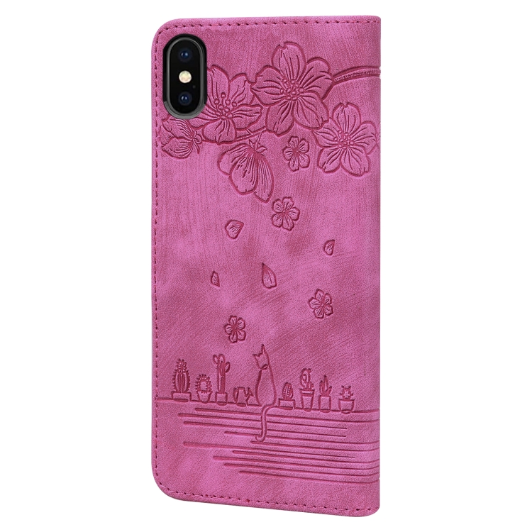 Funda para iPhone X Xs Cartoon Sakura Cat Estuche de Cuero En Relieve (Rosa Roja)