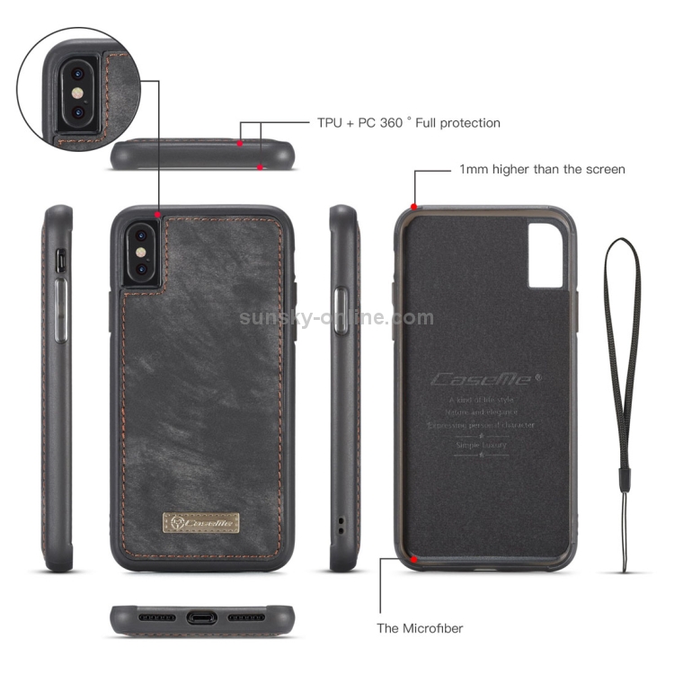 Funda para iPhone X Xs Caseme-008 TPU PC Absorción Magnética Cubierta Trasera Desmontable Cuero Tapa Horizontal Soporte Ranuras Tarjetas Billetera Cremallera Marco Fotos (Negro)