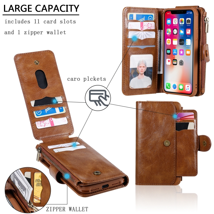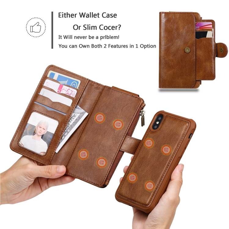 Estuche para iPhone X Xs de Cuero con Tapa Horizontal Magnética Desmontable Multifuncional con Ranuras para Tarjetas Soporte Billetera y Marco de Fotos (Marrón)