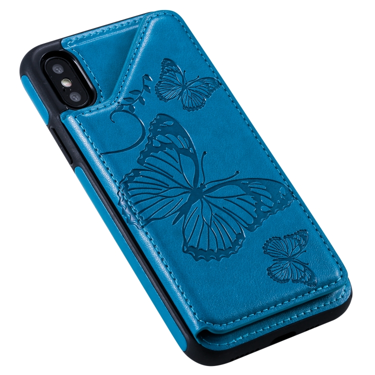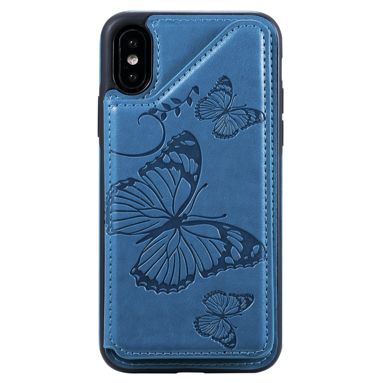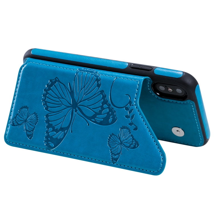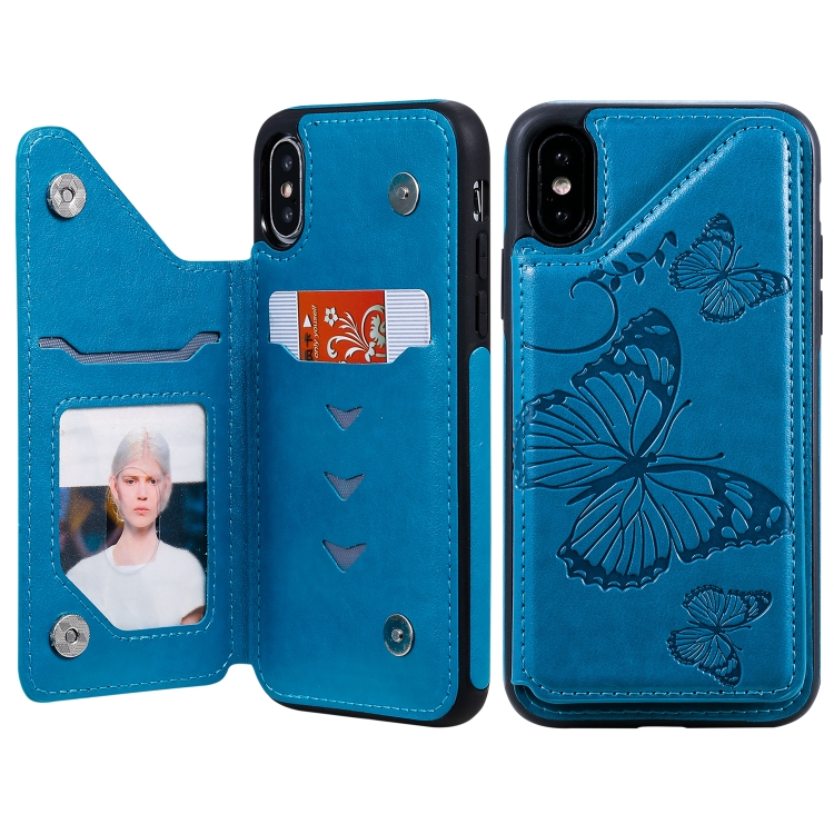 Funda Protectora iPhone X y Xs Estampado Mariposas Soporte Ranuras Tarjetas Marco Fotos (Azul)