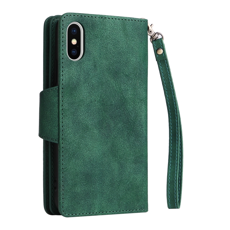 Funda para iPhone X / Xs Cuero Hebilla de Remache 9 Tarjetas Tres Pliegues (Verde)