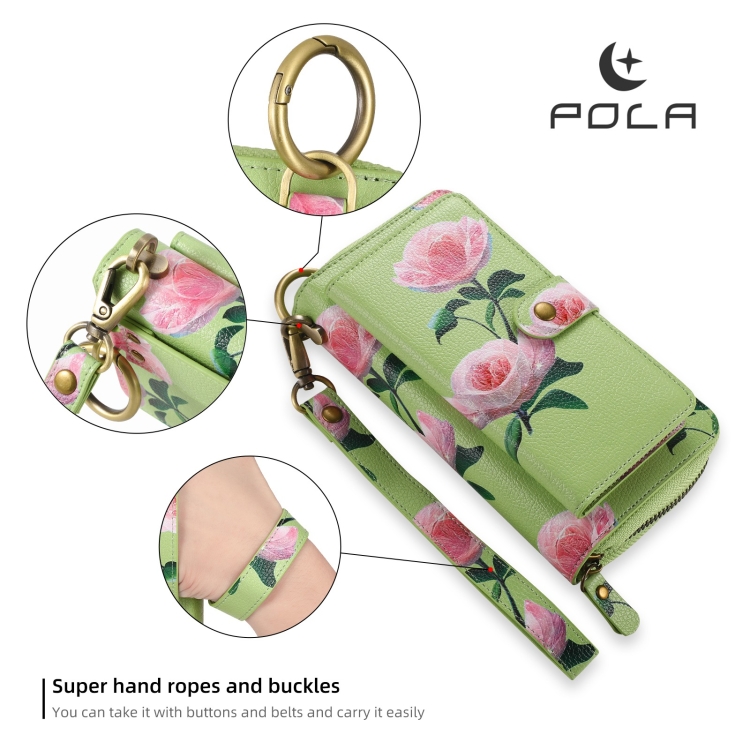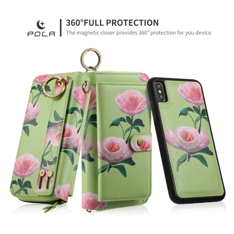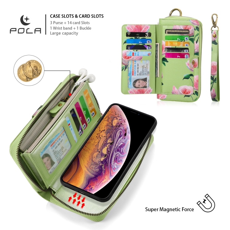 Funda de Cuero Pola Flower para iPhone X Xs con Billetera y Cremallera Multifuncional (Verde)
