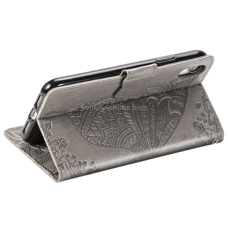 Estuche de Cuero para iPhone Xr Butterfly Love Flowers con Tapa Horizontal en Relieve Soporte Ranuras y Cordón (Gris)