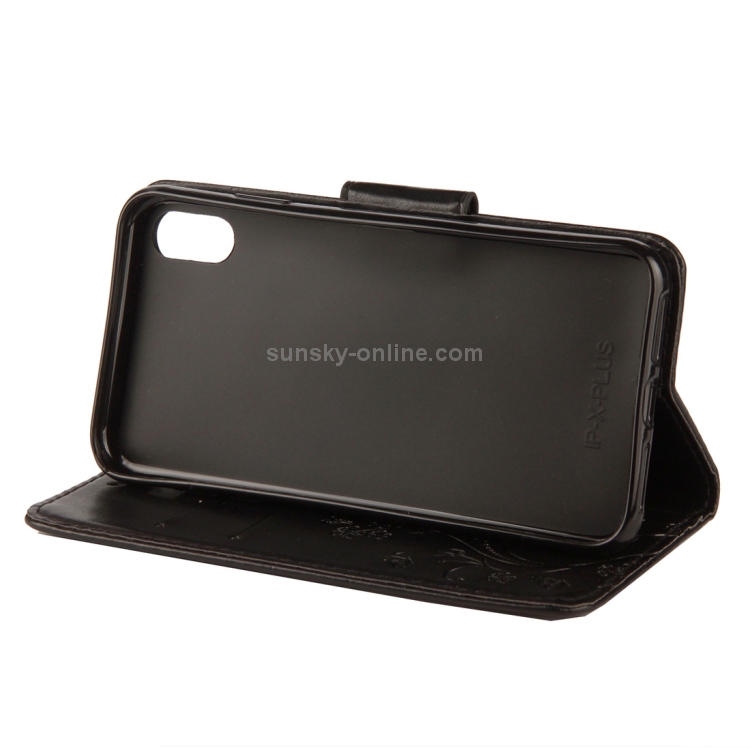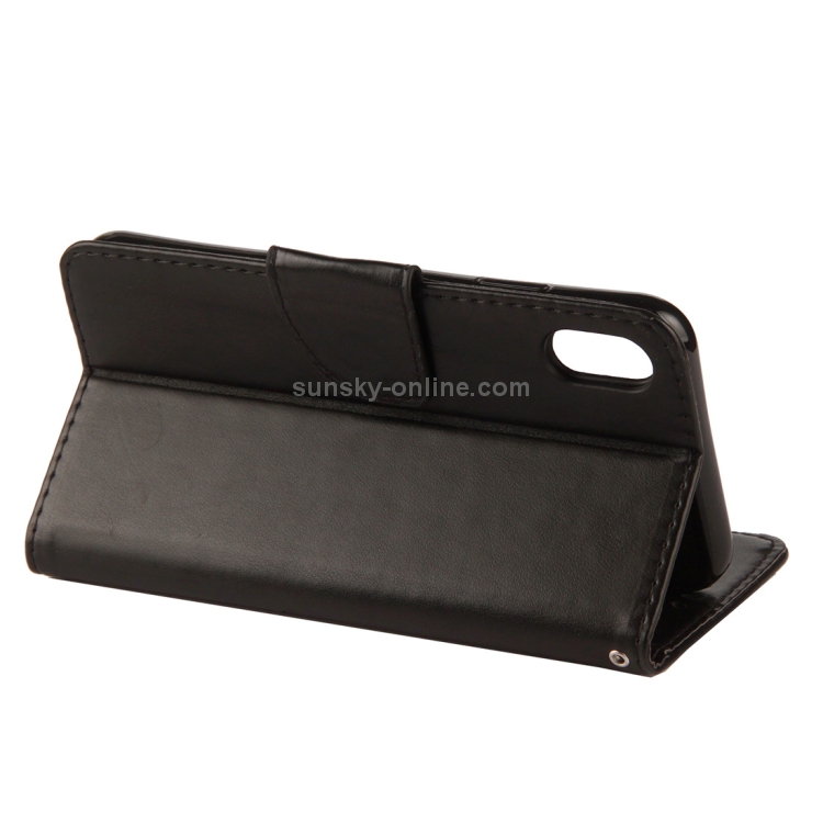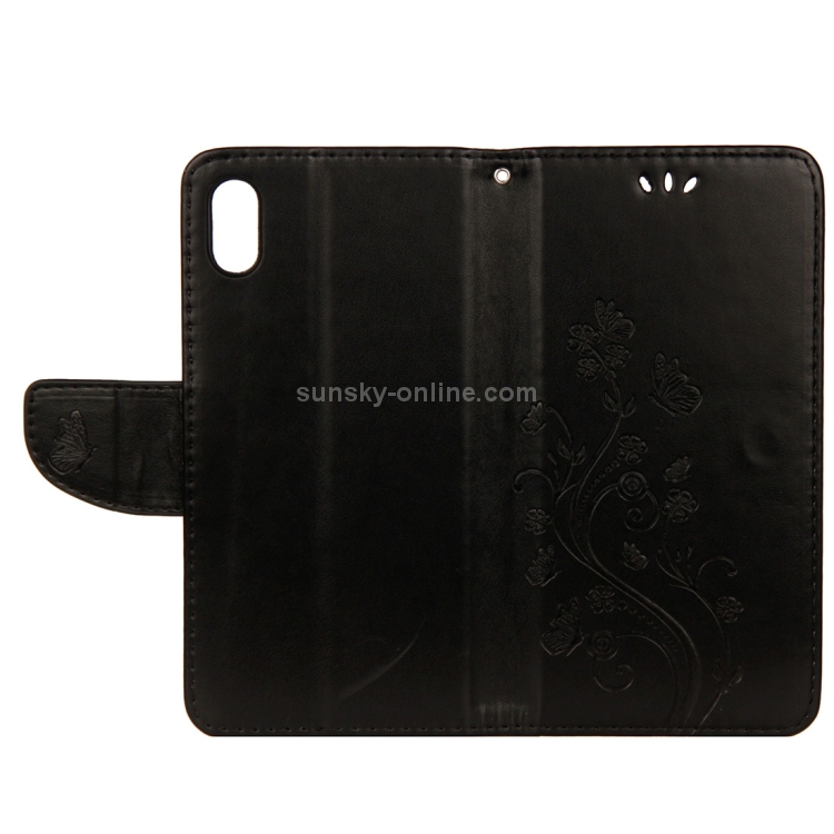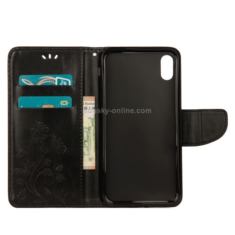 Estuche de Cuero para iPhone Xr con Tapa Horizontal Patrón Mariposa Ranura Tarjeta Soporte Billetera Cordón (Negro)