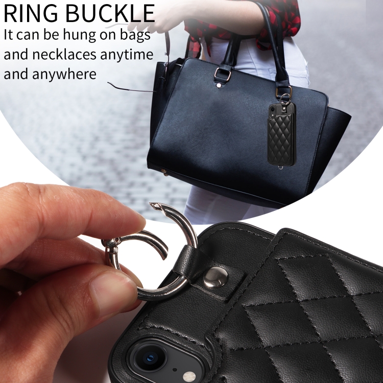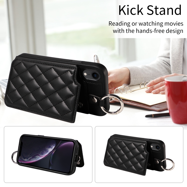 Estuche para Teléfono iPhone Xr con Bolsa para Tarjetas Textura Rómbica y Cordón Corto (Negro)