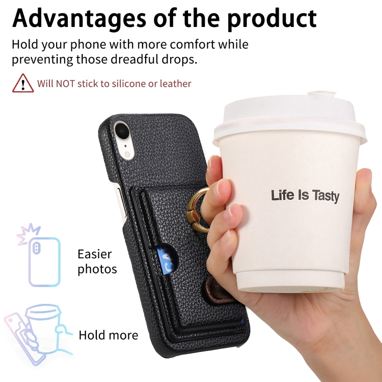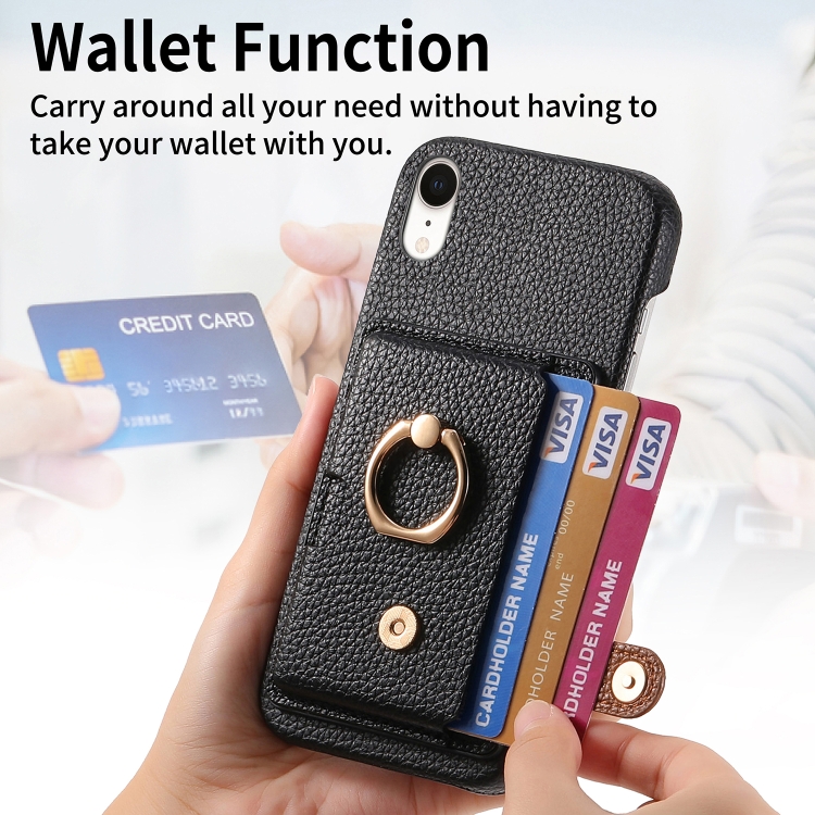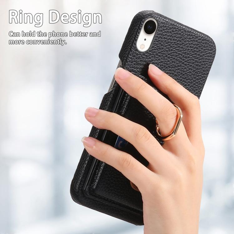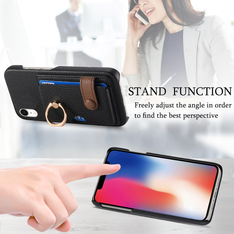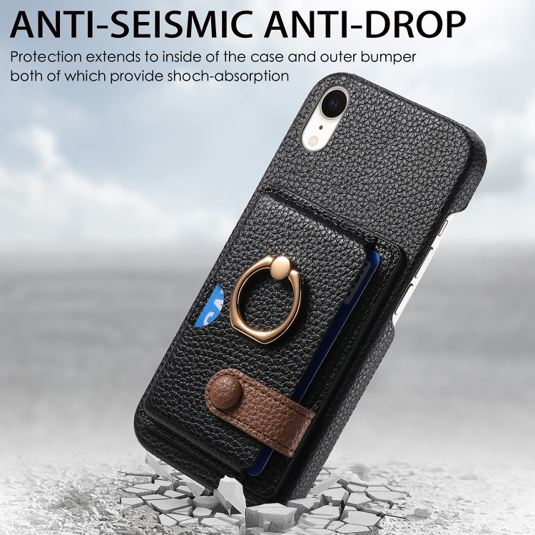 Funda para Teléfono iPhone Xr Parte Posterior de Tarjeta Anillo Borde Aceite Cuero Litchi (Negro)
