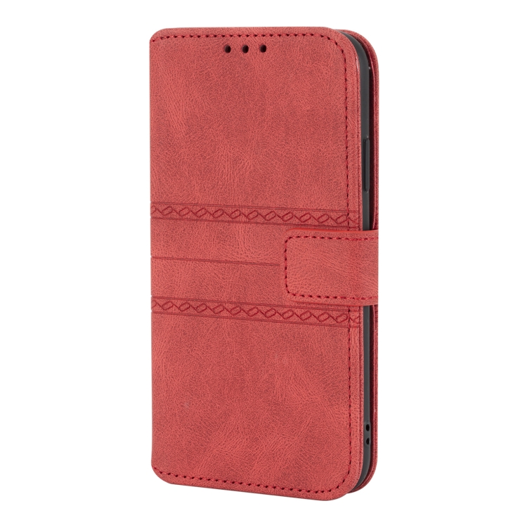 Estuche de Cuero para iPhone Xr Hebilla Magnética a Rayas PU + TPU con Tapa, Soporte, Ranura para Tarjeta, Billetera, Marco y Eslinga (Rojo)